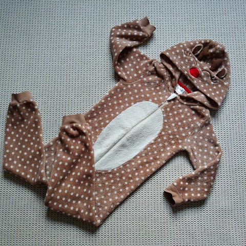 Ciraf fleecehaalari, koko 116 cm. Haalari on vaaleanruskea ja siinä on valkoisia pilkkuja. Edessä vetoketju, hupussa poron/peuran sarvet. Haalari on ehjä ja siisti.