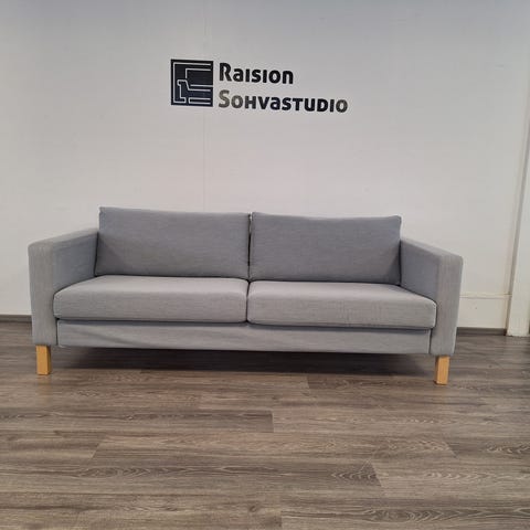 Myynnissä Karlstad 3:n istuttava sohva ja samaa sarjaa oleva rahi. Karlstad sohva on hyvin selkälinjainen. Sohvan runko on kunnon puuta ja vaneria. Ei siis lastulevyä. Sohvan runko ja jouset ovat ehjät. Sohvan ja rahin kaikki kankaat ovat irroitettavissa pesuun. Rungonpäälliset mukaan lukien. Lisäksi sohvan istuin ja selkätyynyjen kankaat ovat ympäriverhoillut. Tyynyt siis käännettävissä. Tämä luonnollisesti tuplaa kankaat, että itse tyynyjen käyttöiän. Korkeat jalat mahdollistavat helpon puhtaanapidon sohvan ja rahin alta. Huomioitavaa päällisten kunnossa: Rahin päällisessä "isohko" haalea tahra. Näkyy kirkkaassa valossa. Lisäksi sohvan istuintyynyjen päällisissä muutama haalea tahra. Kyseiset tahrat huomioitu hinnassa rankalla kädellä. Ryhmän hinta: 269e.