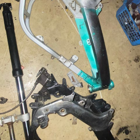 Elikkä loppukesästä ostettu kilvellinen Dt vm 2007. Olen mopon toinen omistaja. Rabasa e3 koneelle alettu tekemään kiinnikkeitä mutta ei mitään kovin peruuttamatonta. Osa osista hiekka puhallettu ja maalattu osa ei.
