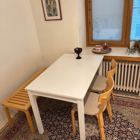 75x75cm pieni ruokapöytä. Löytyy kolhuja ja värjäytymiä, mutta ihan siisti ja todella tukeva. Sopii yksiöön hyvin, kuljetuskin mahdollista.