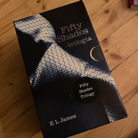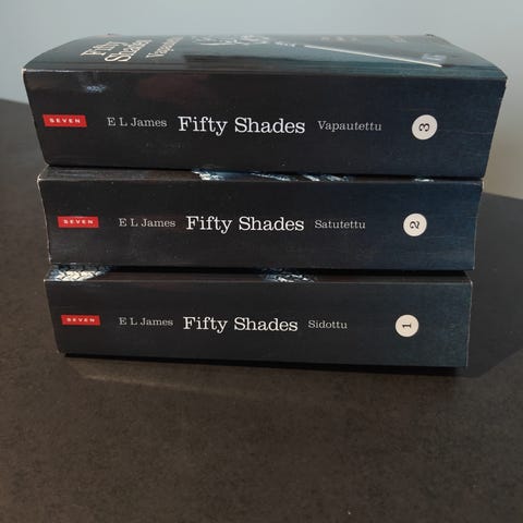 E L James Fifty Shades -kirjasarja, joka sisältää kolme osaa: Sidottu, Satutettu ja Vapautettu. Kirjat ovat suomenkielisiä ja pehmeäkantisia/pokkareita.