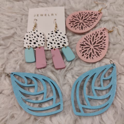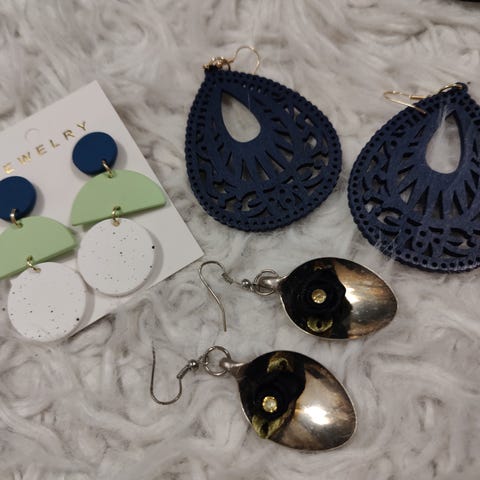 Kuvassa olevat kolmet korvikset, yksiä vähän käytetty, kahdet käyttämättömät. Lähetys toridiilinä.