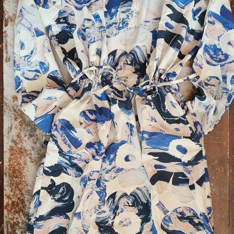 Puuvillakankainen väljä paitamekko, jossa vyötäröllä kiristysnauha. Pääntiellä ja hihoissa nappihalkiot, sivusaumoissa taskut. Helmassa sivuilla halkiot.