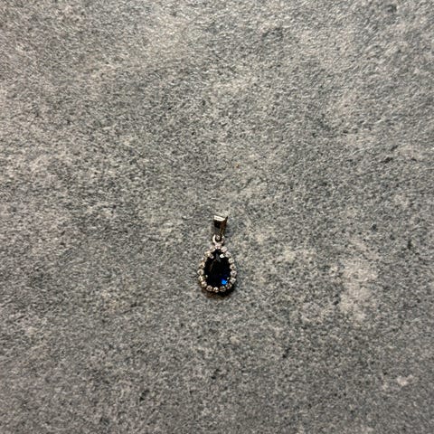 14 karaatin valkokultainen zirkoniariipus, leimat riipuslenkissä takana. Korkeus lenkin kanssa n. 1,3 cm.
