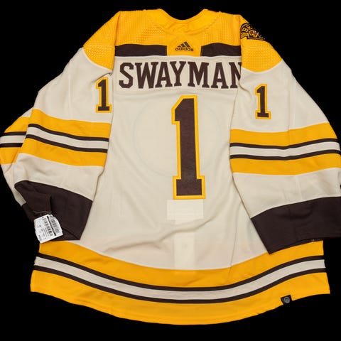 Myynnissä on valkoinen Boston Bruins Centennial (Boston Bruins 100-vuotta) Adidas Prime Green maalivahdin pelipaita Jeremy Swayman:n nimellä ja numerolla. Paita on valmistettu Kanadassa ja laadultaan ja kooltaan samanlainen, kuin Swayman:llä.