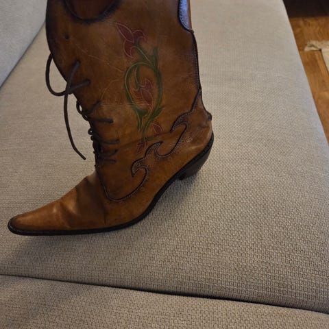 Mustat polvipituiset saappaat, joiden varren yläosa on käännettävissä. Valmistettu pehmeältä vaikuttavasta nahasta tai nahkajäljitelmästä, ja niissä on matala kantapää sekä hieman kapea kärki.Koko: ei ole koko tietoaVäri: mustaMateriaali: nahka/nahkajäljitelmä