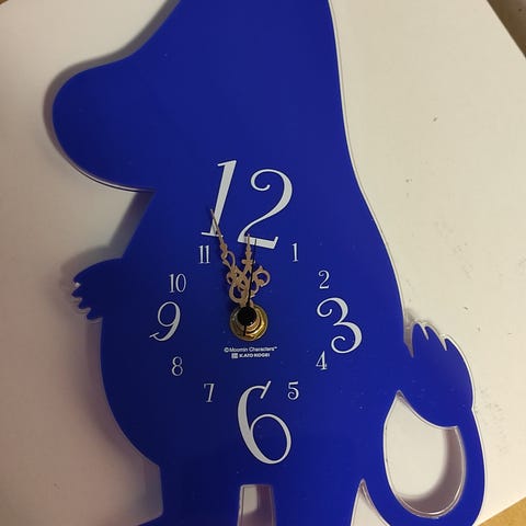 Muumi Niiskuneiti herätyskello 90- lukua. Rallattaa laulua "herää jo on hyvä päivä tänään". Suurinpiirtein pysyy ajassakin. Kukkakimppu ja perhonen otsalta puuttuvat. Kellertymää. Patterien suojus puuttuu.