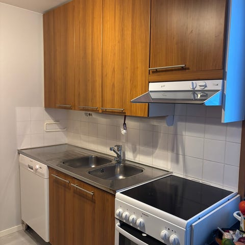 Annetaan keittiökaapit ja tasot. Allaskaappi saanut kosteutta ja sen runko huono, muuten vielä hyväkuntoisia. Kaapit nyt irrotettu.