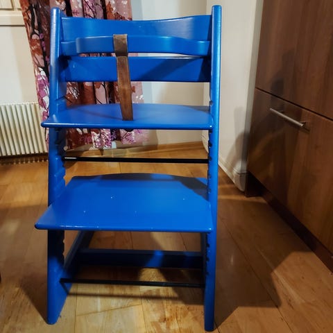 Ehjä, tukeva stokken tripp trapp tuoli. Kaari ja nahkavyö. Käytetty kunto, lakka kulunut.