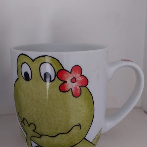Muki, jossa on vaaleansininen tausta ja sammakko-kuvio, lisäksi perhonen, sudenkorento ja kukka koristeena. 5 dl .