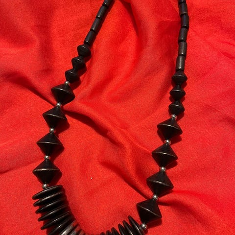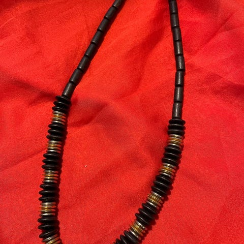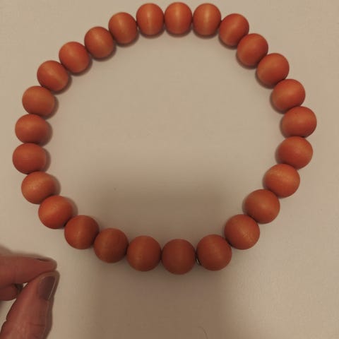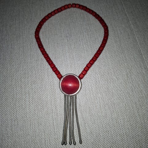 Aarikan kaulakoru, punaisilla ja ruskeilla puupalloilla. Pituus 34 cm. Korussa on kuminauha.