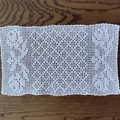 Vanha, valkoinen, ohuesta langasta virkattu pitsiliina. Halkaisija n. 28 cm.