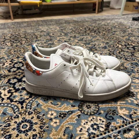 Adidas Tennarit koko 40, musta väri valkoisilla yksityiskohdilla. Kengät ovat käytetyt ja niissä on kulumaa kannassa.