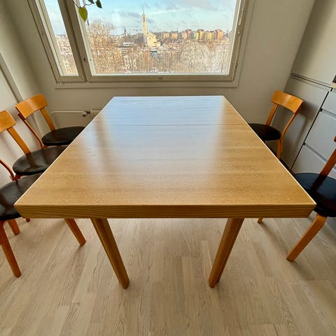 Jämäkkä, käytetty ja käyttökuntoinen. Koivuosissa kulumaa. Jalat on toisesta Artekin pöydästä. Ruuveja ei ole