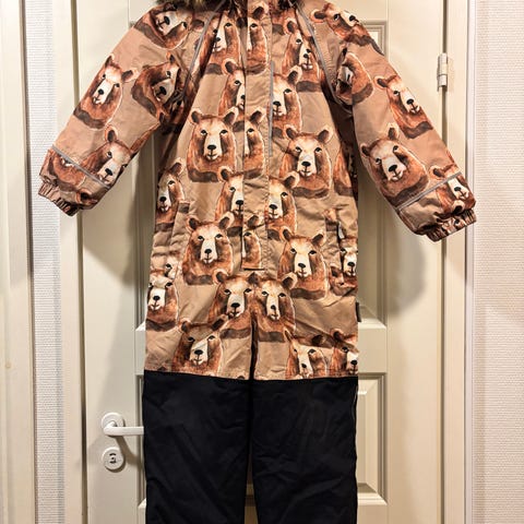 Ihana lämpöinen talvihaalari. Ollut käytössä kaksi talvea. Hyväkuntoinen. Yritin kuvata pienet karhentumat jota huomasin (tarralista, kyynärpää). Karhentumat häviävät kuosiin, lähinnä tarkemmalla syynäyksellä erottuvat. Jalkarenksut puuttuu. Polvet ja takapuoli hyvässä kunnossa, ei juuri kulumaa. Naulakon rinksu irronnut toiselta puolelta.