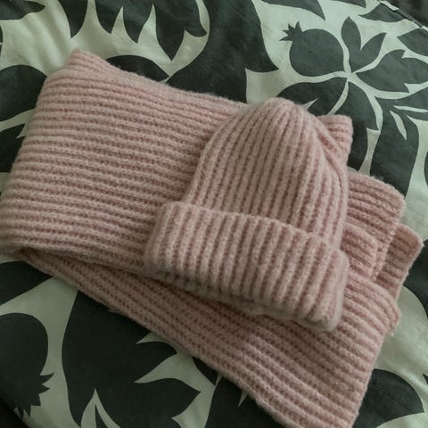 Vaaleanpunainen akryylituubikaulaliina ja myssy setti naisten M