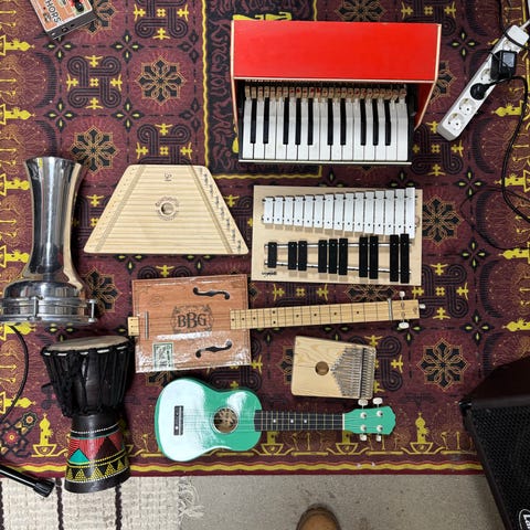Kaksi puumarakassit, symbaalit, triankeli, kellot ja kulkuset. Paljon käytetty soittimet. Koko setti 5 €.