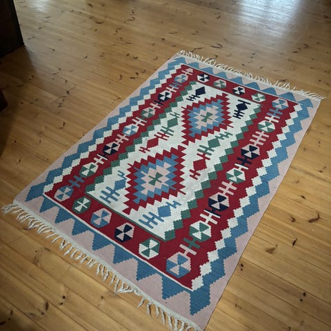 Vaihdetaan Kelim matto. Kaunis, aito ja todella hyväkuntoinen villamatto aitoustodistuksella. Kaipaisin vähän eri väriä, punaista, sinistä, ehdota! Vaihdan mieluiten samankokoiseen tai isompaan kelimiin mutta voi ehdottaa muutakin. Hinta uutena 750€