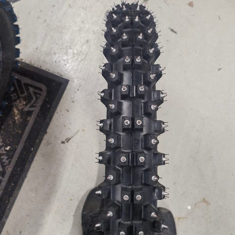 Vähän ajetut michelin piikkirenkaat 110/100-18 ja 80/100-21. Kaikki piikit tallella