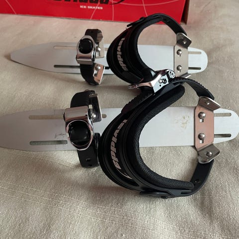 Naisten retkiluistimet, säädettävä terä (koko 37-41) kiinnitetään tukevaan vaelluskenkään. Lähes käyttämättömät.