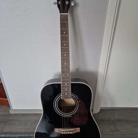 Harley Benton akustinen kitara johon juuri vaihdettu kielet. Soi hyvin ja pysyy vireessä.