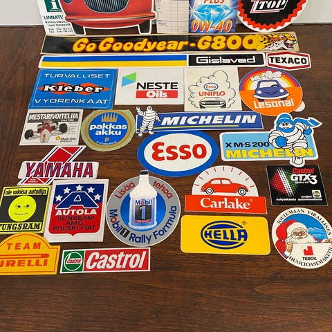 Huoltoasema- ja autoiluaiheisia tarroja 1960-luvulta alkaen.