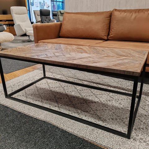 Valkoinen sohvapöytä jossa kannen alla säilytystila joka käytettävissä molemmin puolin.