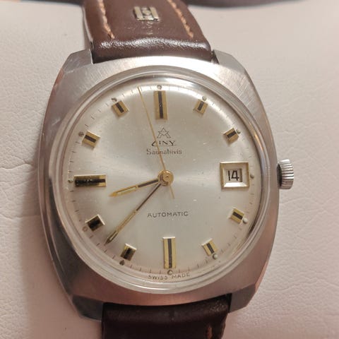 Erittäin elegantti vintage Ciny automaattikello päivyrillä. Ciny oli pienempi sveitsiläinen valmistaja jonka päämarkkinat Sveitsin ulkopuolella olivat Ranska ja Suomi. Kello käy ja pitää hyvin aikaa. Uusi ranneke joka sopii tyyliin todella hienosti.