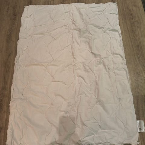 Vauvan ohut peitto 102x72 ja siihen sopiva valkoinen pussilakana, jossa beige nalleraita