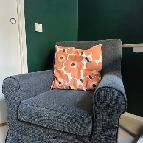Tuolissa on havaittavissa joitakin tahroja ja kulumaa, erityisesti käsinojissa ja istuintyynyssä. Alkuun verhoilulle pesu.