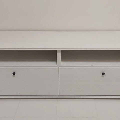 Ikea BORGSJÖ valkoinen tv-taso. Pieniä jälkiä toisen laatikon ovessa (kts. kuva), muuten hyvässä kunnossa.