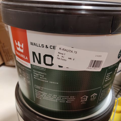Sekoitettu mutta avaamaton Tikkurila Nova 7 sisämaali 9 litraa, väri Mulperi. Maali soveltuu sisäseiniin ja katoille, tarjoaa mattapintaisen lopputuloksen.