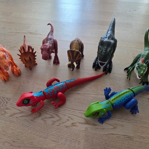 Kuvan lelut. Isompi Dino ääntää mutta ei liiku. Nouto Hyllykallio.