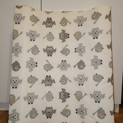 Mini Rodinin kätevä kokoontaitettava hoito-alusta / matkahoitoalusta. Ulkopuolella vaalea heppakuvio ja sisäpuolella sininen leopardikuvio. Kunto erittäin siisti.