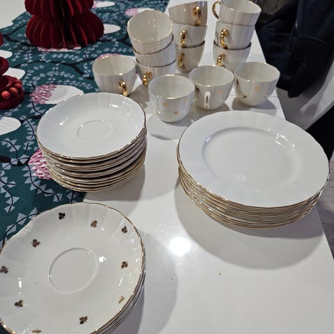 Setti Arabian astioita. 10 leipälautasta, 6 kuppia asetteineen, 2 teekannua ja yksi kulho. Kaikissa astioissa Arabian leimat pohjassa, 21 astiassa on piippuleima (1932 - 1949) ja 4 astiassa kruunuleima (1964 - 1971). Kaikissa astioissa myös signeeraukset (H.H, SH., S.E.O. ja ST-). Myydään kaikki astiat kerralla, hinta sisältää nämä kaikki astiat.