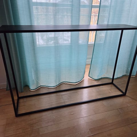 Myydään eteisen sivupöytänä toiminut täyspuinen konsolipöytä. Pöytä on tehty itse ja näkyvissä on käytönjälkiä.