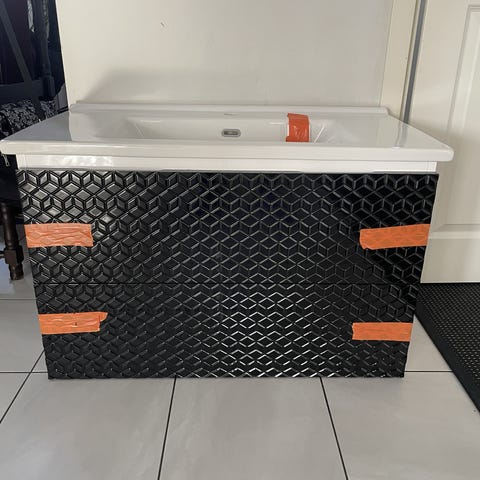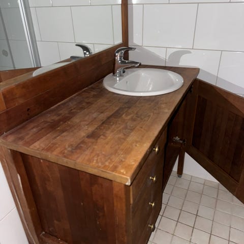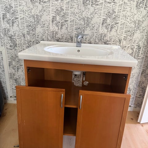 Allaskaappi valkoisella pesualtaalla ja kaapeilla