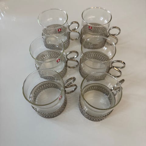 Iittala lasiset tsaikat, joissa metallinen/hopea kahvakorut. Setti sisältää viisi kappaletta.