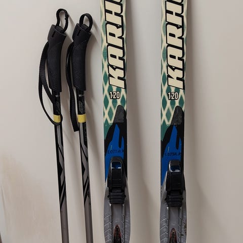 Lasten/nuorten 160cm sukset, numero 37 mono, siteet, sauvat ja suksipussi. 2 lapsella pienellä käytöllä olleet.