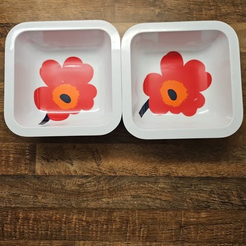 Myyn Marimekon Unikko pienen lautasen, 10 x 10 cm. Väri on valkoinen, pinkkiin menevä puuteri ja tummanpunainen.