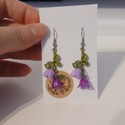 Käyttämättömät, käsintehdyt kielo/kukka korvikset. Koukut ovat kirurginterästä.