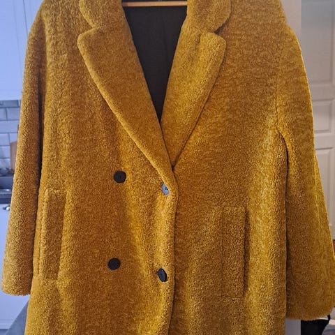 Ruskea tekoturkis liivi, missä takaosa on palmikko neuletta. Edessä yksi hakas kiinnitys. Vastaa mielestäni kokoa L jos kiinni haluaa pitää.