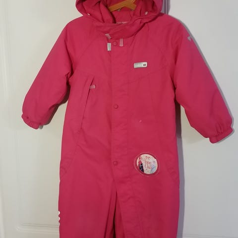 Reiman punainen/pinkki talvihaalari koko 92. Haalaria on käytetty paljon ja siinä on kulumaa ainakin polvissa ja pepussa, mutta kangas on kuitenkin ehjä. Ominaisuuksia ei välttämättä ole enää.