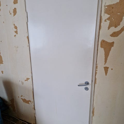 Sisäovi valkoisella pinnalla. Oven mitat ja materiaali eivät ole tiedossa.