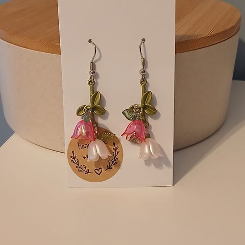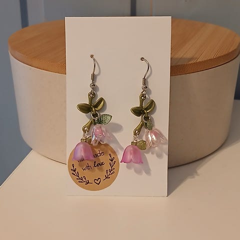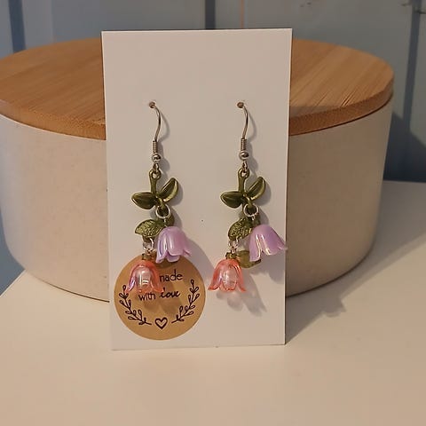 Käyttämättömät, käsintehdyt liilat kielo/kukka korvikset. Koukut ovat kirurginterästä.