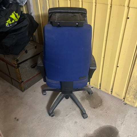 Sininen toimisto tuoli hyvä kuntoinen, kork. selkänojan kanss 100cm, istuin kork.50cm,sini -musta väri.Säädettävä korkeus.