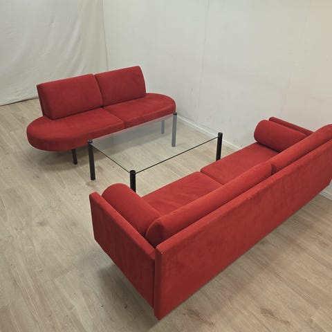 Myydään hyväkuntoinen ja moderni punainen sohva ryhmä, johon kuuluu kaksi erikokoista sohvaa sekä lasinen sohvapöytä. Kalusteet ovat siistit ja tukevat, ja sopivat hyvin esimerkiksi olohuoneeseen, toimistoon tai vastaanottotilaan.