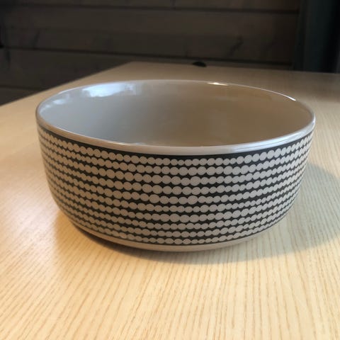 Marimekko kulho, jossa mustavalkoinen kuosi. Valmistettu keraamisesta materiaalista.