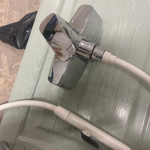 Oras suihkuhana letkulla. Suihkusekoittaja termostaatilla.