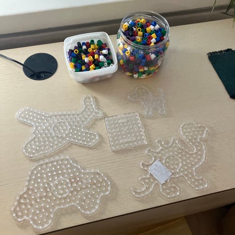 Setti eri värisiä hamahelmiä ja kolme alustaa.